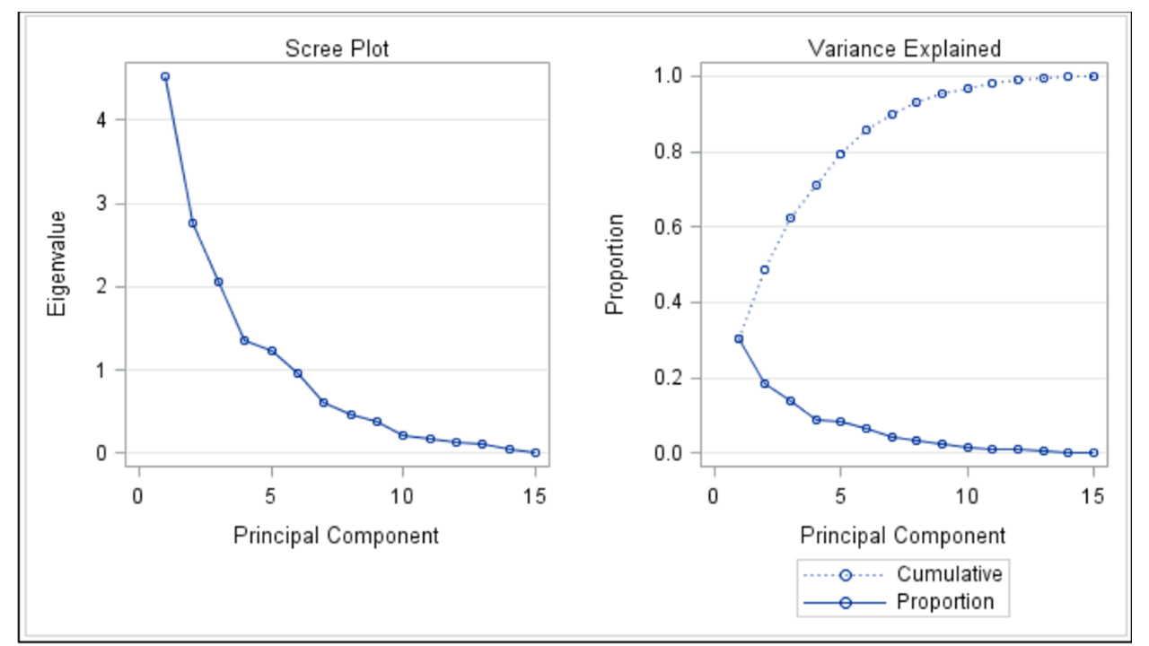 \[ \begin{array}{ll} \lambda_T = \lambda_1 + \lambda_2 + \dots + \lambda_i & \rightarrow \quad \text{Overall variance} \\[8pt] \lambda_i \; (\text{proportion}) = \dfrac{\lambda_i}{\lambda_T} & \\[8pt] \text{Cumulative } \Lambda = \dfrac{\sum \lambda_{\text{interest}}}{\lambda_T} & \end{array} \]