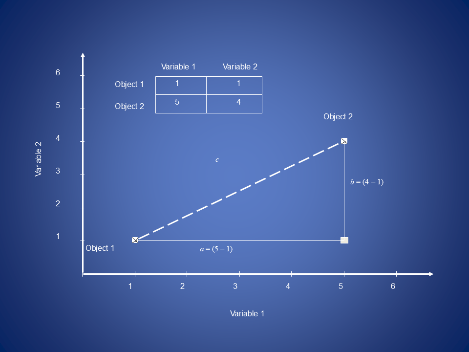 \[d_{1,2} = \sqrt{(5-1)^2 + (4-1)^2} = 5\]