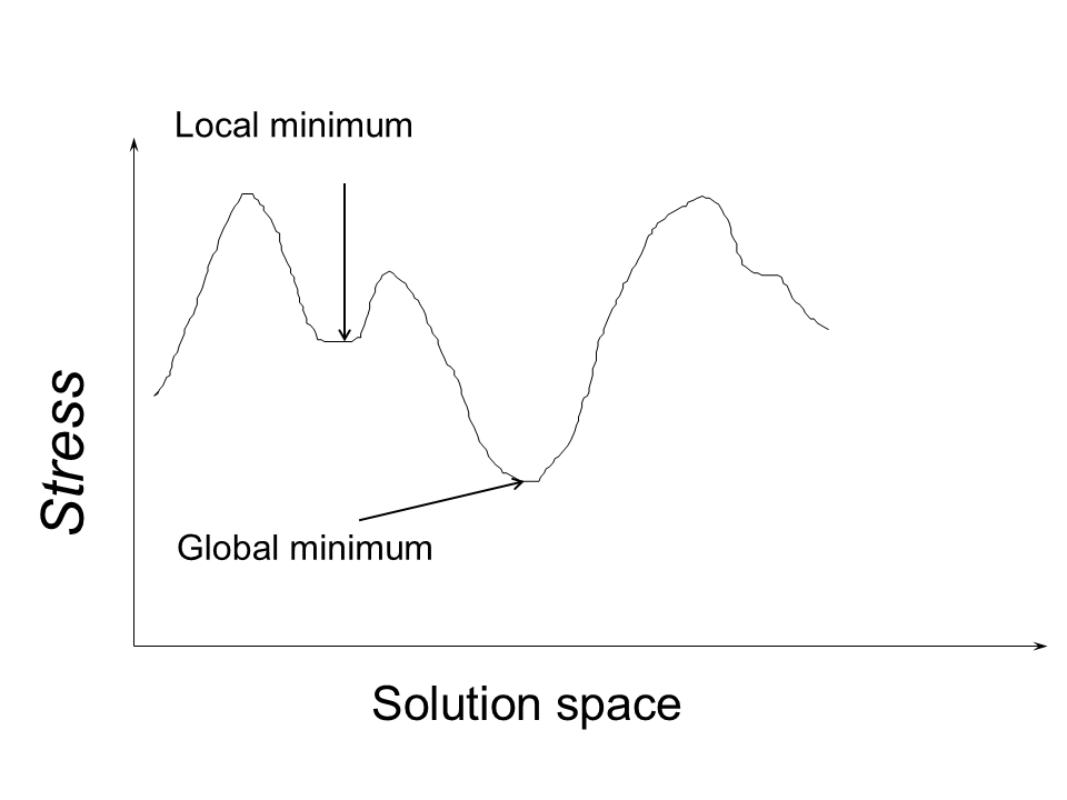 \[ \text{S} = \frac{ \overbrace{\displaystyle \sum_{j<k} \left( d_{jk} - \delta_{jk} \right)^2}^{\text{Sum of squared residuals (MDS distance vs perfect regression)}} }{ \underbrace{\displaystyle \sum_{j<k} \delta_{jk}^2}_{\text{Sum of squared perfect regression distances (original distances)}} } \]